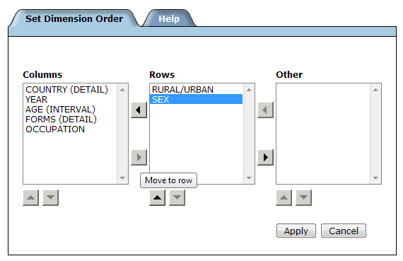 By default, most of the dimensions are organized on the left side of the table. The order of these dimensions can be rearranged to highlight what is of interest in the analysis. There must always be at least one dimension in the row bar and column bar. To rearrange the dimensions, click the “Set dimension order” from the Table tab. This allows users to move and modify the order of the dimensions.